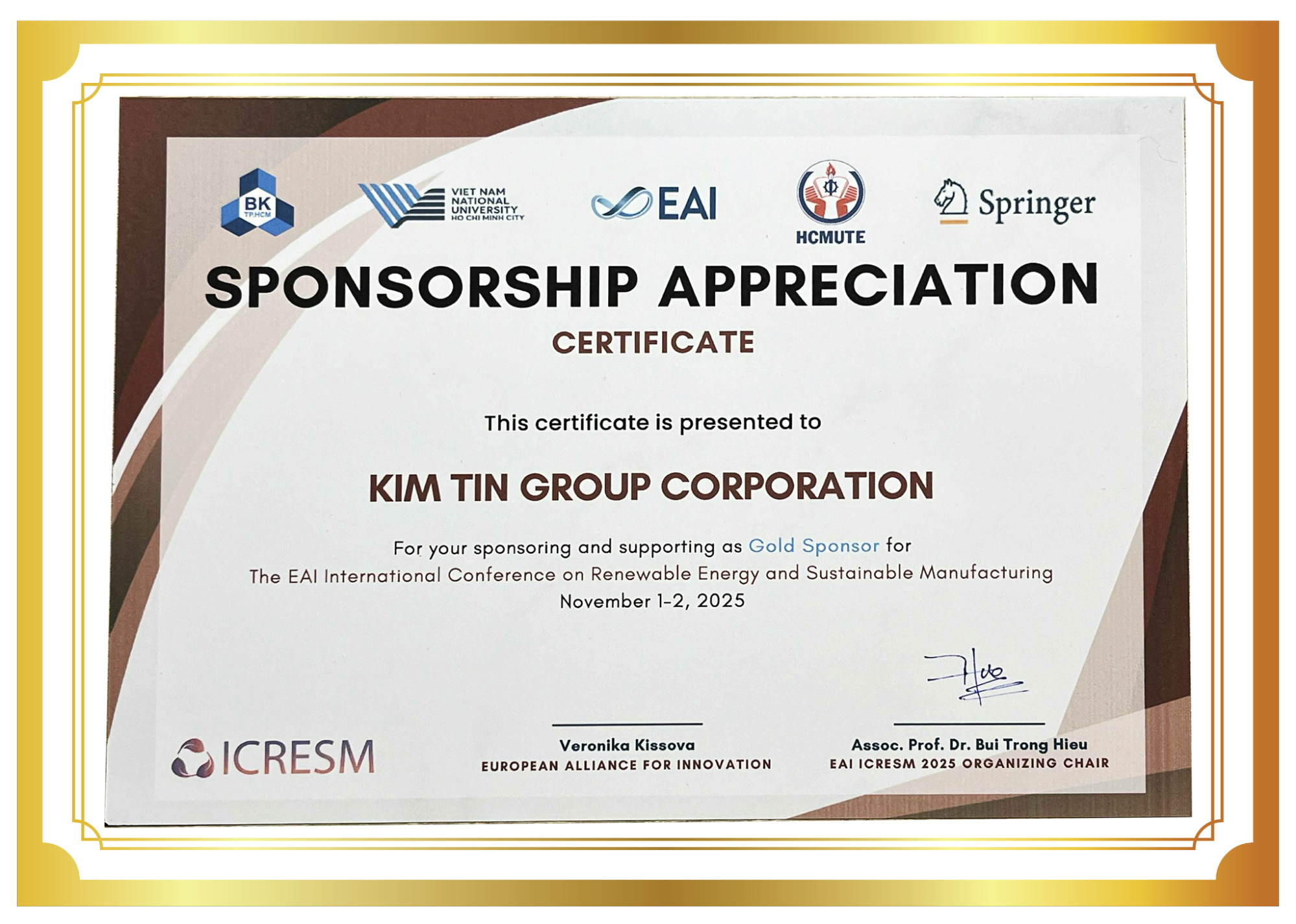 Ngày 02/11/2025, Tập đoàn Kim Tín tiếp tục khẳng định cam kết đồng hành lâu dài cùng Khoa Cơ Khí khi trở thành Nhà tài trợ Vàng của Hội nghị Quốc tế về Năng lượng tái tạo và Sản xuất bền vững (EAI ICRESM 2025).